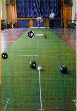 Indoor bowls mat (45 feet long x 6 ft wide) with balls.