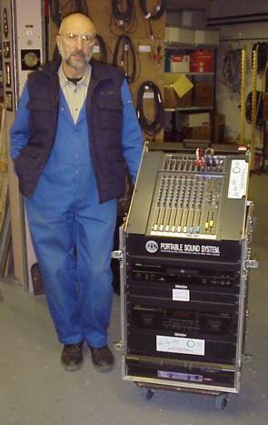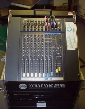 The main unit, which is on casters and has handles to make transport easier, has an 8 way mixer desk, single CD player, twin cassette decks and amplifier built in.
