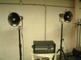 The outdoor PA has four horn speakers mounted on tripods, an 100 watt mixer amplifier with inputs for microphones and tape / cd players.